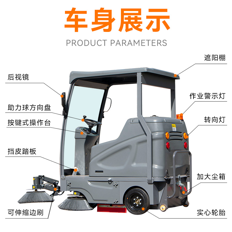 LT-A19型半封闭式扫地车,清扫宽度1500-2100mm,可手动调节伸缩,改变清扫宽度。满电工作时间3-4小时,工作效率:15600㎡/h,采用的是4块80A的大品牌铅酸免维护电池。应用场景:厂区、车间、公园、街道、物业小区、码头、学校、机场等场地。